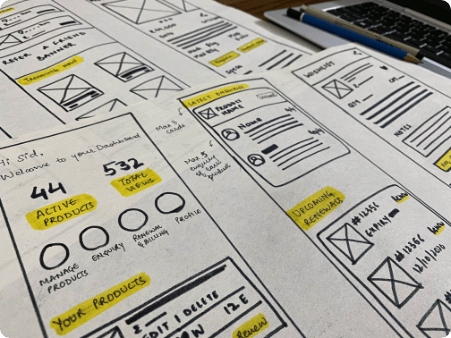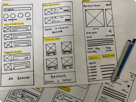 Wireframing process started with prioritizing the features that would best address the users' needs and the business goals throughout the app. As an example, for the product page, since we had to showcase a lot of data points and call-to-action buttons (like product name, share button, price, maximum quantity of the product, etc.), we had to carefully plan the placement of each item so that important information doesn’t go unread. As another example, there were pages where users had to scroll through a list of different product categories. To break the monotony, we placed attractive offer banners for the related category items.