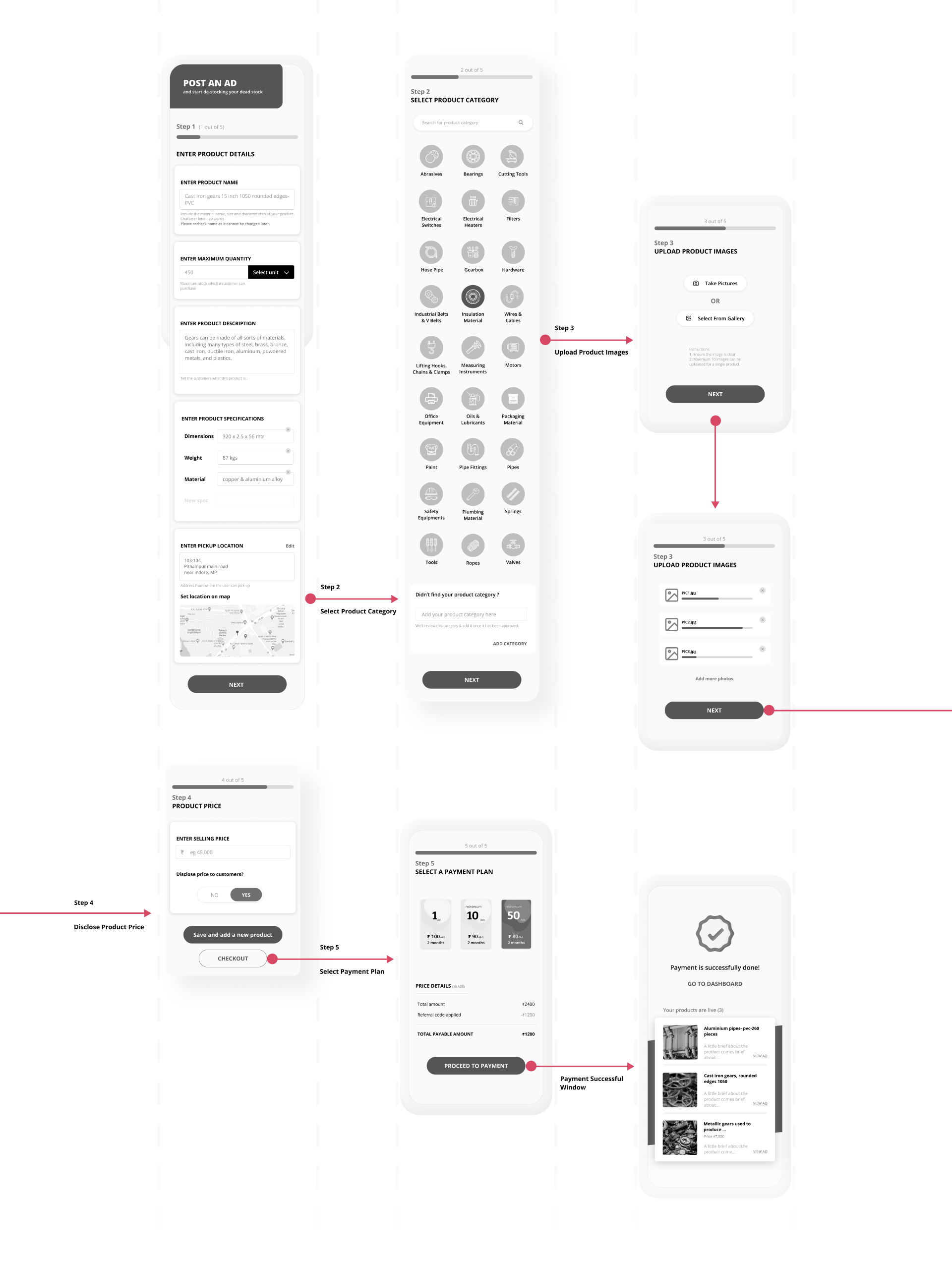 Since De-stock was an early stage start-up, they engaged us to define a clear value proposition. We analyzed that most of their primary customers - the sellers, had to switch from physical to digital mode of dealing. Hence, there had to be no friction in posting their first advertisement on the app. We suggested a freemium pricing strategy where the seller could post the first few ads free of cost just to become accustomed to selling on De-stock. Onboarding the buyers was equally important to sustain the app. Based on the analysis, we decided to keep a progressive onboarding journey for buyers to minimize the cognitive load for new users.