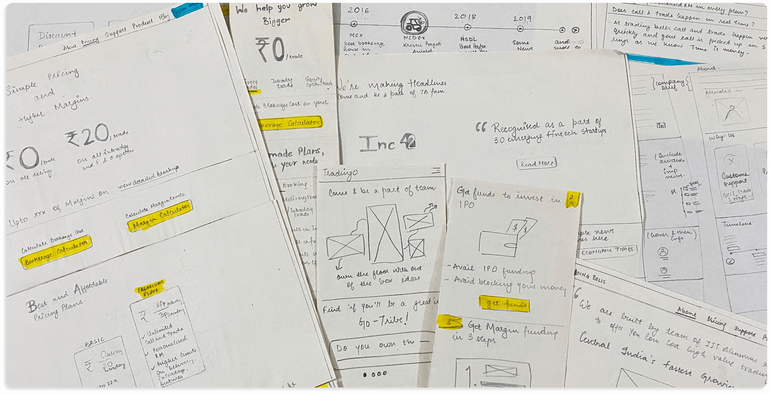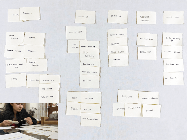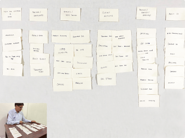 For users, any website is easy to navigate if they find what they are looking for without diving deep into the website, i.e., placing the functionalities in consistency with their past experiences. The ideation process always involves conducting a few workshops with stakeholders to quickly come-up with astonishing ideas. As an example, we conducted a card sorting workshop. The primary goal of a sorting activity was to discover which items should be grouped together and what these groups should be called. For this activity, we involved potential new users, daily traders, and other company officials. Participants were asked to organize the cards which had topics from the website. This activity enabled us to conclude the terminology, relationships and categorize various topics that helped us frame the website's information architecture. Other workshops helped us to simplify technical words, the process of signing-up, etc.