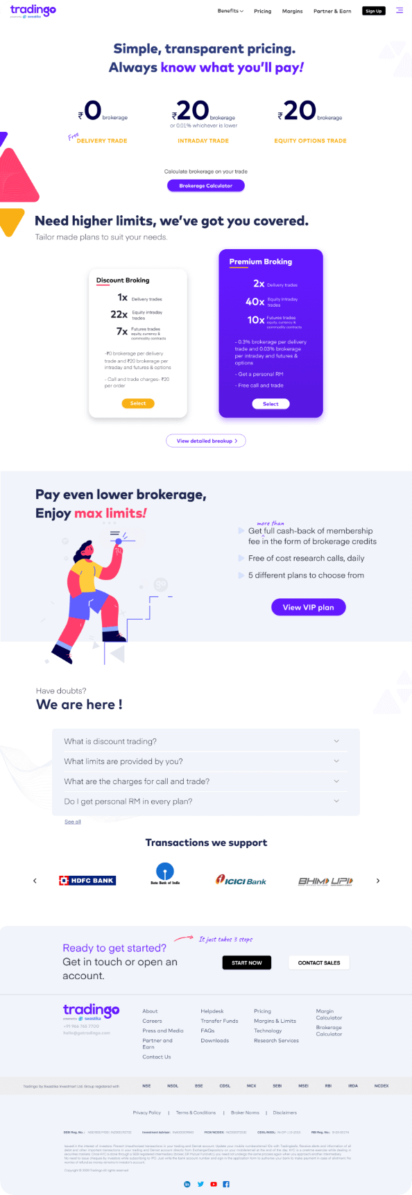 Quirky designs were used to cut the boredom, which is usually associated with stock trading. We chose the right fonts and bright colors to connect to a younger audience and match the brand’s vibe. This also gave the website a more youthful look. We reduced the cognitive load of the users by highlighting the commonly used words. We played with the up/down arrows used in the logo and brought the brand’s essence everywhere on the website.